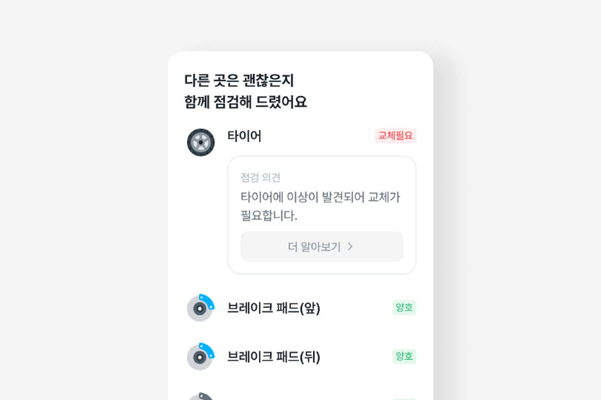 정비는 곧 운전자의 안전입니다. 인증 정비소에서는 안전한 주행을 위해 반드시 관리해야 할 5대 기본 항목(타이어, 브레이크 패드 (앞/뒤), 브레이크 오일, 배터리)를 무상으로 점검해요.